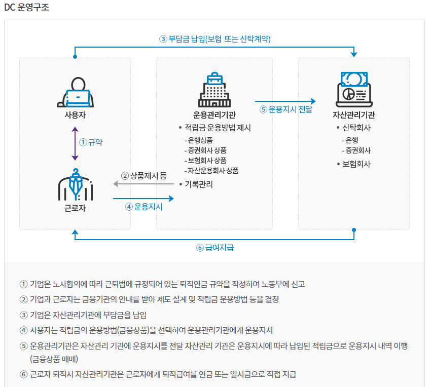 근로자 | 사용자가 연간 임금의 1/12이상을 적립하면 근로자가 이를 운용함 퇴직급여 = 최종 적립금 ± 운용수익 |